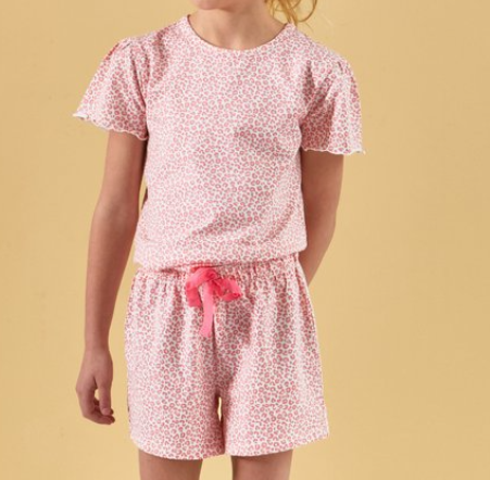 Roze pyjama voor meisjes met T-shirt en shorts, bedrukt met bloemenmotief. Zacht, ademend en ideaal voor warme nachten.